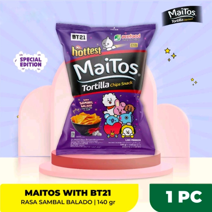 MAITOS TORTILA BT21 RASA SAMBAL BALADO 140 GR . Ready stock kak silahkan diorder. Jika ada pertanyaan lebih lanjut mengenai product, kami siap membantu. Happy Shopping! :)