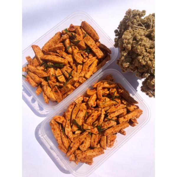 Basreng kering dengan tambahan daun jeruk dengan rasa pedas dan gurih yang selalu bikin nagih dan tidak alot digigitnya.