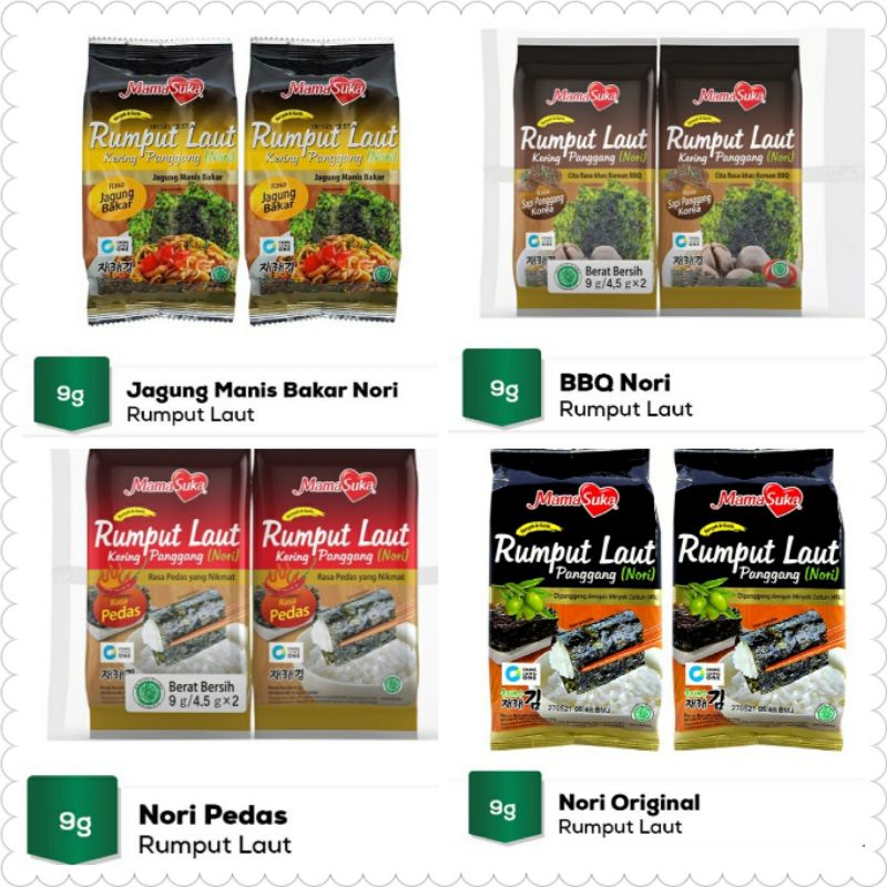 Mama Suka Rumput Laut 2X4.5g - Rumput laut kering panggang (nori) rasa pedas, jagung bakar & barbeque sapi panggang yang nikmat renyah & gurih persembahan Mama Suka kini hadir untuk anda pecinta nori atau rumput laut kering. Cocok di mix dengan makanan lainnya untuk menambah rasa unik yang lezat pada setiap makanan anda. Dapatkan Mama Suka Rumput Laut Panggang 2X4.5g di sini