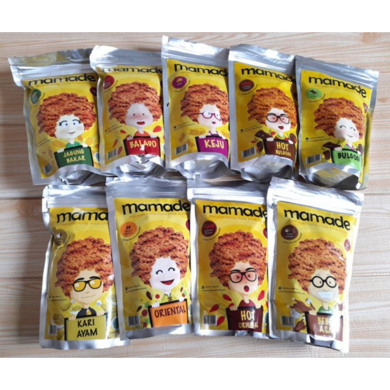 Berbahan baku gandum dengan texture renyah, packaging zipper lock bisa ditutup kembali jika sudah dibuka, dengan balutan bumbu homemade tebal berkualitas, dan Mamade ini aman dikonsumsi karena sudah terdaftar di dinkes (P-IRT) dan bersertifikat Halal MUI