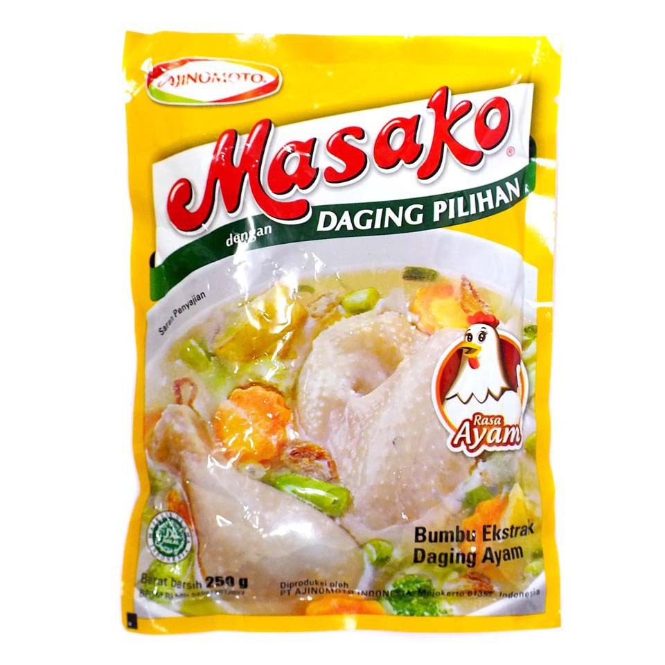 Bumbu penyedap siap pakai masako rasa Ayam, dibuat dari ekstrak daging ayam segar, garam, gula, penguat rasa, bumbu rempah dan lemak ayam.