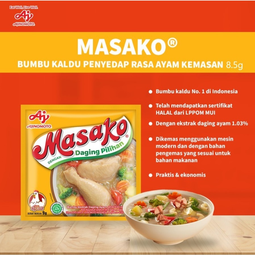 Masako® bumbu ekstrak daging ayam, dibuat dengan daging ayam yang berkualitas serta kombinasi bumbu dan rempah pilihan. Menghasilkan rasa kaldu yang lezat, seperti kaldu buatan sendiri di rumah, untuk masakan sehari-hari dengan cara yang mudah dan praktis. Masako® sajikan #KenikmatanHakiki untuk keluarga, makanan jadi makin enak dan lezat, jadi pingin tambah lagi! Kandungan garam/ natrium 520 mg per sajian Sesuai dengan angka kecukupan gizi yang direkomendasikan yaitu