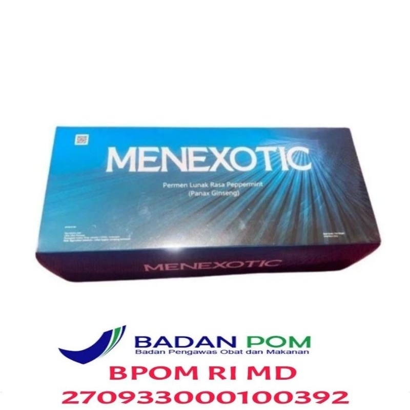 MenExotic permen lunak yang pengolahannya menggunakan teknologi fermentasi modern dan canggih, dengan kandungan konsentrat dan bahan racikan Sou Yang ( Cynomorium Songaricum ) Asal Korea, Protein Hidrolis, Enzyme, Gula Sirup, Menthol, Yang kemudian diolah bersamaan dengan campuran radik ginseng ekstrak Korea, Malt dan lain-lain