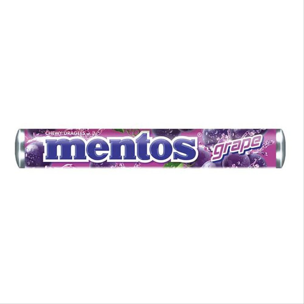 Permen mentos dengan rasa grape dalam bentuk roll yang mudah dibawa bepergian.