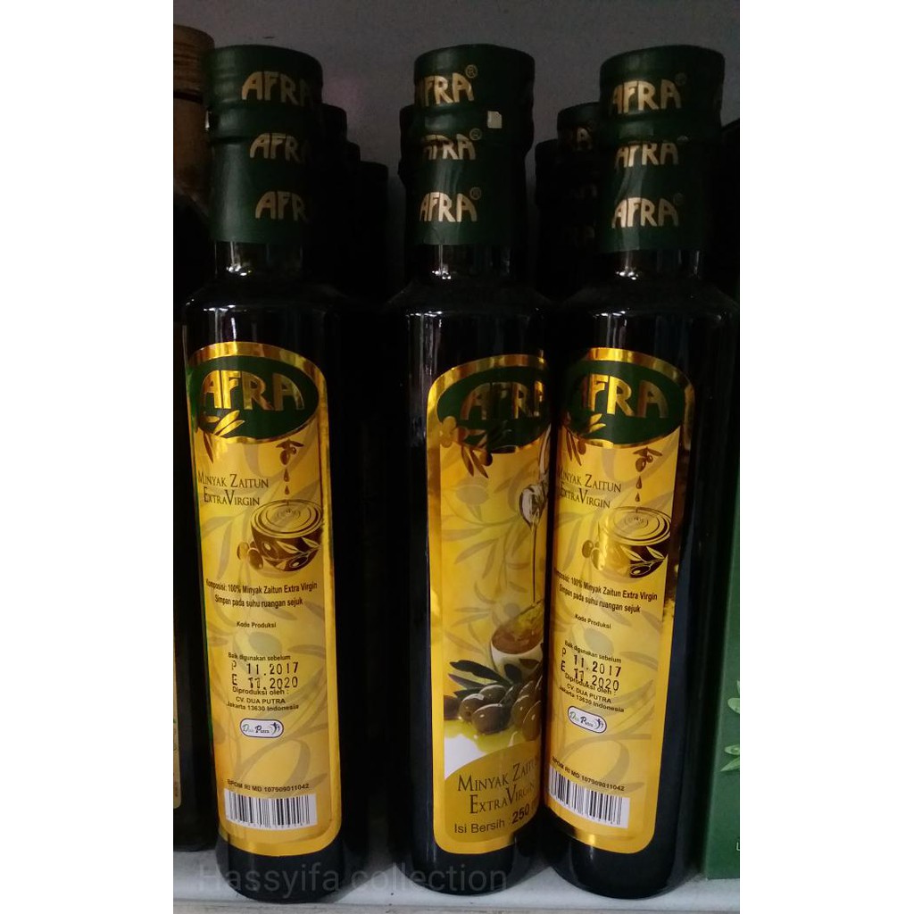 AFRA merupakan minyak zaitun extra virgin (minyak perawan) yang dihasilkan dari perasan buah zaitun pertama dan merupakan minyak zaitun terbaik karena tidak melalui banyak proses sehingga memiliki kualitas yang lebih tinggi. Aman diminum atau dioleskan, bermanfaat sebagai obat luar dan dalam, sebagai campuran makanan atau masakan, minyak urut, minyak rambut, penghalus kulit, untuk kecantikan wajah, pijat ataupun lulur.