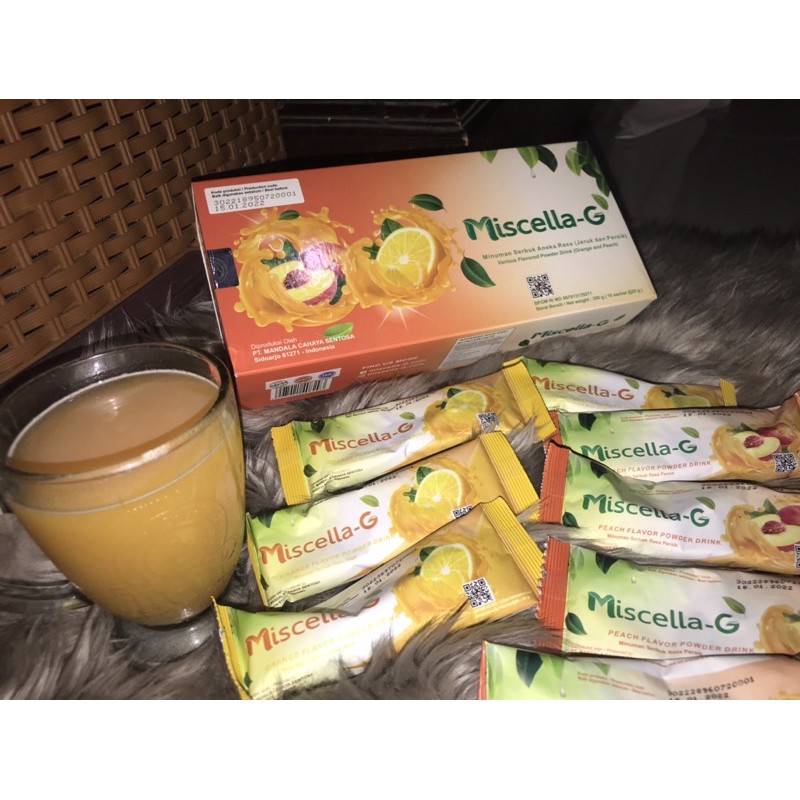 dalam 1 box MISCELLA-G, ada 5 sachet rasa jeruk, dan 5 sachet rasa peach,, Kereeeen kaaan,,, Jadinya gag bosen lhooo bisa ganti2 rasa....