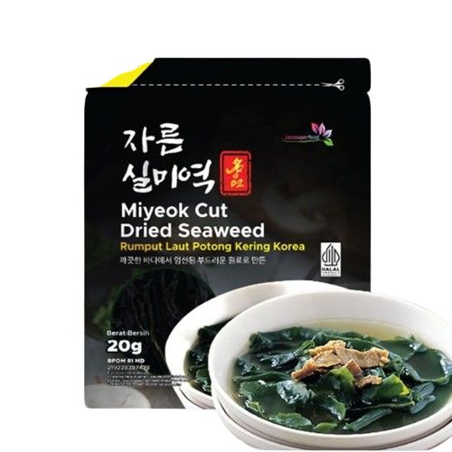 Miyeok Cut terbuat dari 100% rumput laut kering Korea yang sudah dipotong. Miyeok bisa disajikan untuk sup rumput laut, salad, ditumis, Ramen, udon dan Miso Soup.