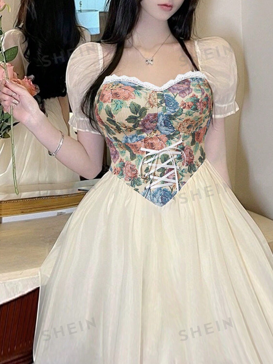 MOD Платье большого размера с короткими рукавами и цветочным принтом, рюшами по подолу и вырезом в форме сердца Shein, мультиколор