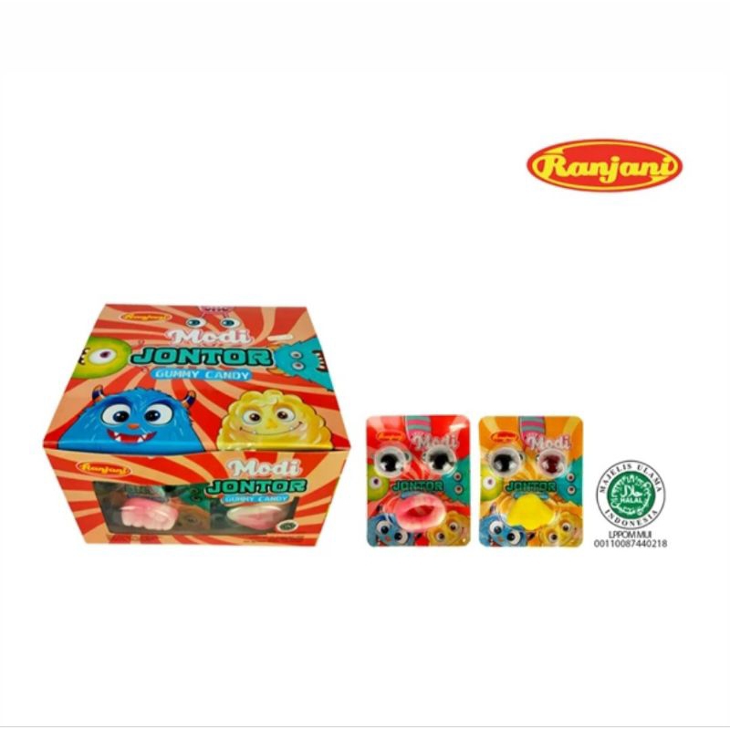 Permen Gummy Ranjani Modi Jontor adalah permen Gummy berbentuk menyerupai mata, mulut, bibir dan hidung. Tersedia dalam aneka rasa buah yang enak.