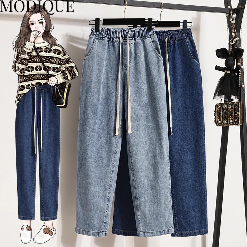 MODIQUE Весна Лето Большие размеры Новые женские свободные базовые винтажные эластичные прямые широкие брюки на шнурке Длинные джинсы Женские повседневные джинсовые длинные брюки Брюки