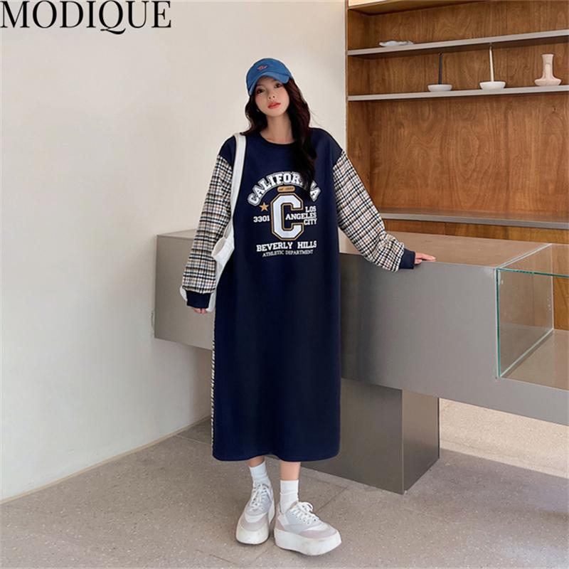 MODIQUE Осень-Зима Большие размеры Женские свободные винтажные плюшевые утолщенные клетчатые длинные платья с буквенным принтом Женские основы Повседневные платья с длинным рукавом и круглым вырезом