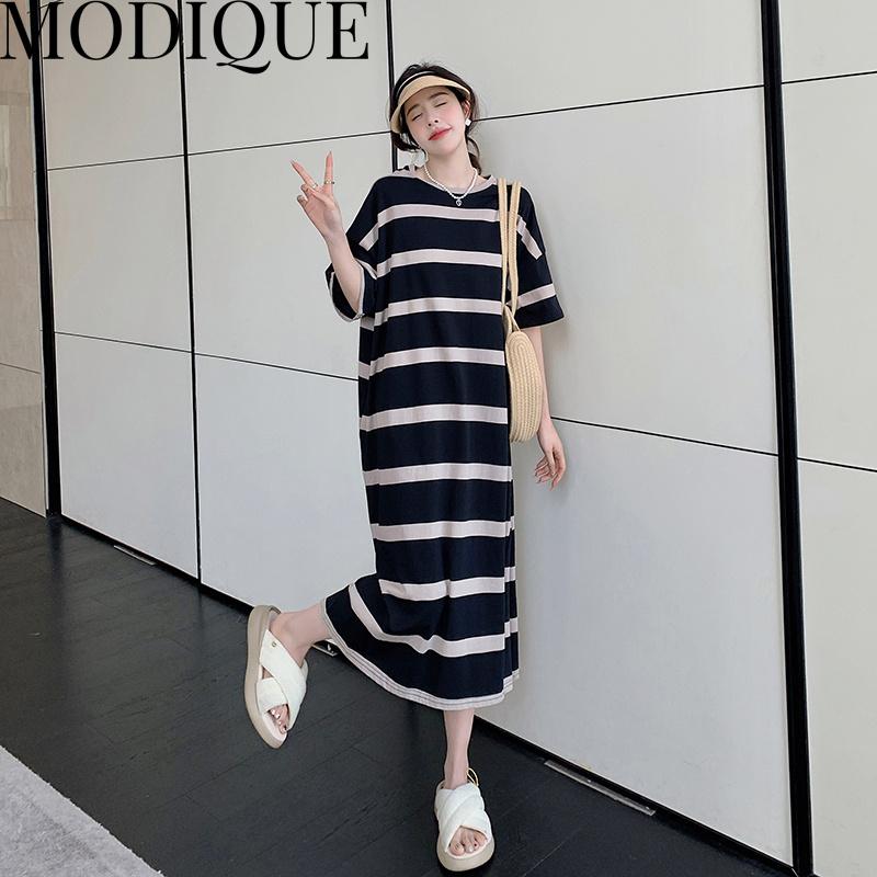 MODIQUE 2023, летняя новая классическая рубашка больших размеров, женская свободная полосатая хлопково-льняная винтажная одежда, базовые повседневные женские платья с круглым вырезом