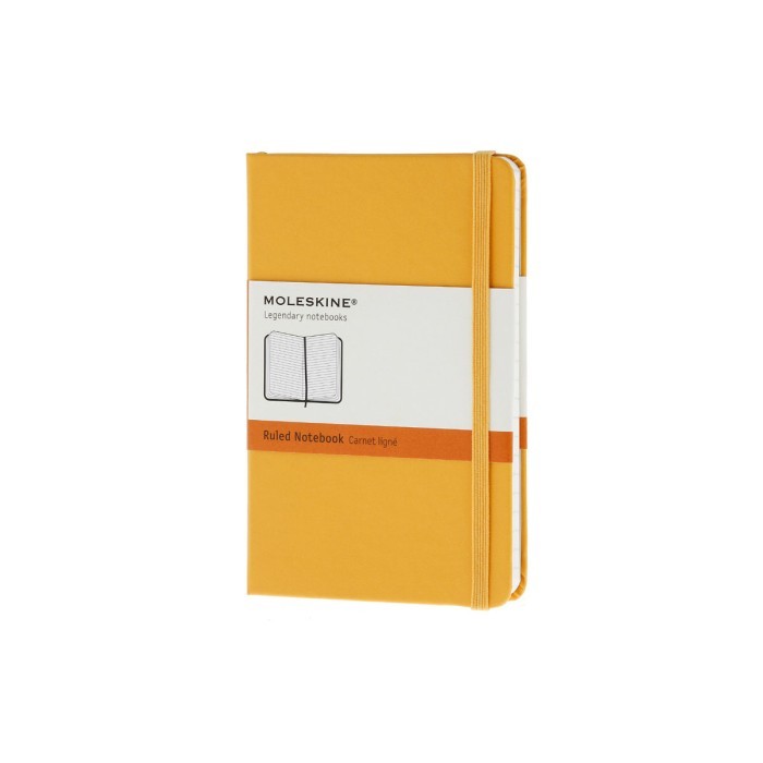 MOLESKINE Pocket Ruled Notebook Orange Yellow Hard Cover Moleskine brings more color to its notebooks. This Orange Yellow version of classic Ruled Pocket notebook is perfect for writings, thoughts and passing notes. The color-coded bands reveal the notebook's layout. The back of the paper banderole can be saved for later use. The ribbon, bookmark and expandable inner pocket match the cover color. Specifications: - Layout: Ruled Paper - Dimensions: 3-1/2\ x 5-1/2 r - Hard Cover with elastic closure and bookmark ribbon. - Color: Orange Yellow - Pages: 192 - Expandable Inner-Pocket - Paper Weight: 70 gsm/47 lb. - FSC Certified Paper; Acid-Free (pH Neutral) Details Size (inches): 3.5 x 5.5 Size (cm): 9 x 14 ISBN 13: 978-88-6613-633-0