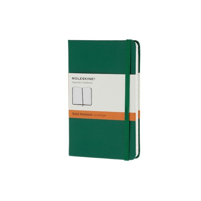 MOLESKINE Pocket Ruled Notebook Oxide Green Hard Cover Moleskine brings more color to its notebooks. This Oxide Green version of classic Ruled Pocket notebook is perfect for writings, thoughts and passing notes. The color-coded bands reveal the notebook's layout. The back of the paper banderole can be saved for later use. The ribbon, bookmark and expandable inner pocket match the cover color. Specifications: - Layout: Ruled Paper - Dimensions: 3-1/2\ x 5-1/2 r - Hard Cover with elastic closure and bookmark ribbon. - Color: Oxide Green - Pages: 192 - Expandable Inner-Pocket - Paper Weight: 70 gsm/47 lb. - FSC Certified Paper; Acid-Free (pH Neutral) Details Size (inches): 3.5 x 5.5 Size (cm): 9 x 14 ISBN 13: 978-88-6613-627-9