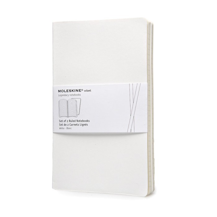 MOLESKINE Volant Large Ruled Notebook White The Volant notebook with white soft cover come packed in set of two. Each set comes with acid free ruled paper and includes the Moleskine history. Details Size (inches): 5.1 x 8.2 Size (cm): 13 x 21 ISBN 13: 978-88-6732-052-3