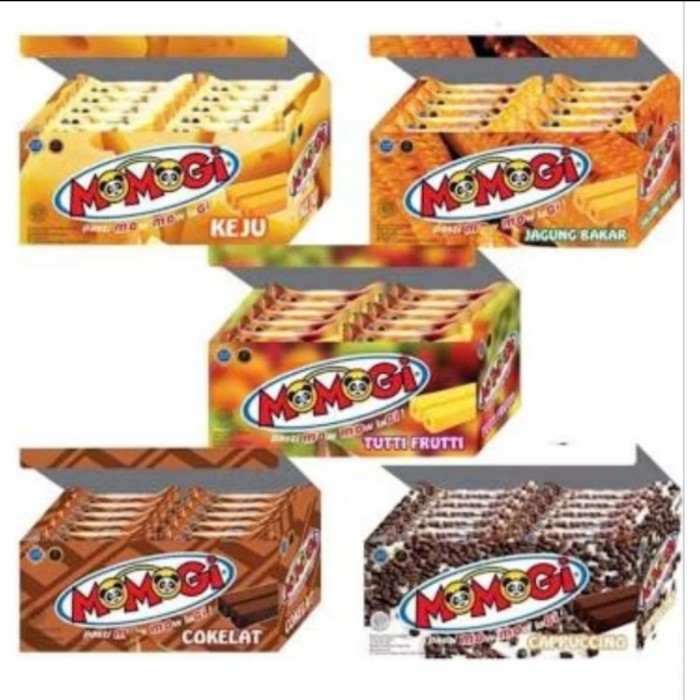 Momogi dengan 2 pilihan rasa yaitu coklat dan jagung bakar. Dikemas dengan isi 20pcs/box dan 10pcs/box.