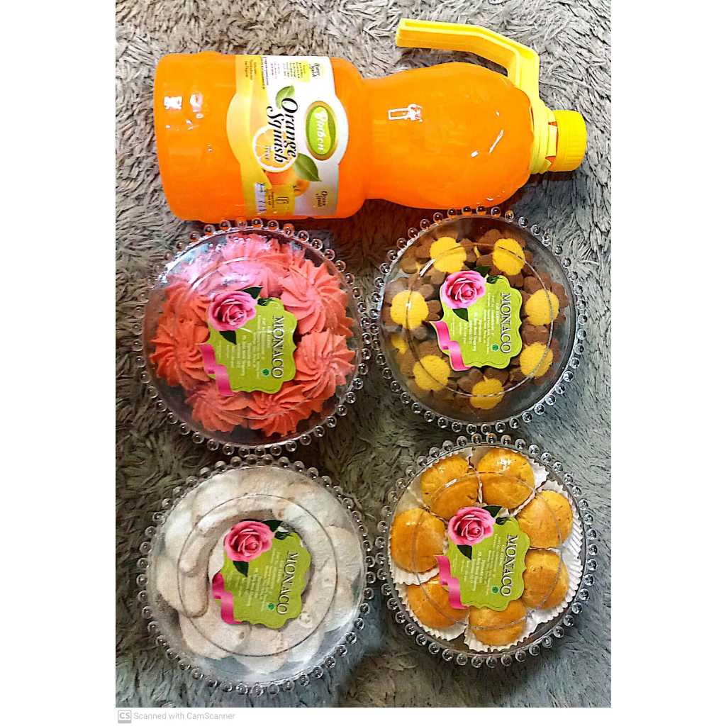 Nastar, Kue Kopi Caramel, Kue Putri Salju, dan Kue Butter Es Doger plus 1 botol Sirup Orange 800ml