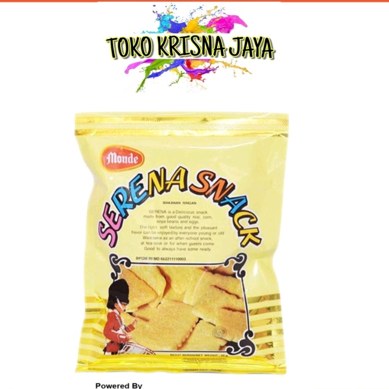 Monde Serena Snack Gold Makanan Ringan [60 g] merupakan makanan ringan Monde yang dirancang berbeda dari makanan ringan lainnya. Terbuat dari beras, jagung, kedelai, dan telur yang diolah menjadi satu dan menghasilkan suatu makanan ringan bertekstur lembut dan menghasilkan aroma yang sedap untuk dinikmati. Rasanya begitu gurih dan sedikit asin, mampu memanjakan setiap lidah yang merasakannya. Dikemas secara sederhana dalam kemasan plastik mudah sobek dan dapat dinikmati kapan saja dan di mana saja.