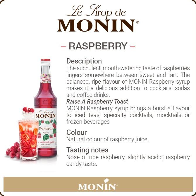 With sweet, fragrant and subtle aftertaste, an almost-melt-in-your-mouth texture, MONIN Raspberry has a very delicious taste. Try to combine it with MONIN Blackberry syrup and you will feel a wonderful forest touch.