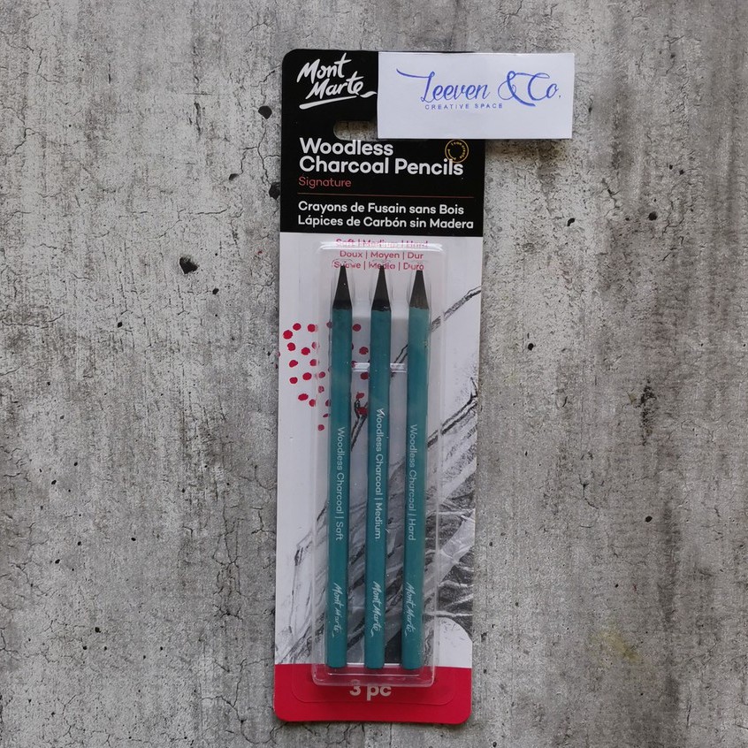 Mont Marte Signature Woodless Charcoal Pencils are made superior grade charcoal. Use the woodless charcoal pencil on an angle for broad strokes or with the sharpened point for fine details. Create highlights with a kneadable eraser.