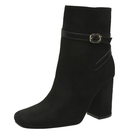 ZIZOCWA Women S Pointed Toe High Heel Ankle Boots Suede Belt Buckle Square Toe Side Zipper Mid Calf Booties Elegant Black Size37