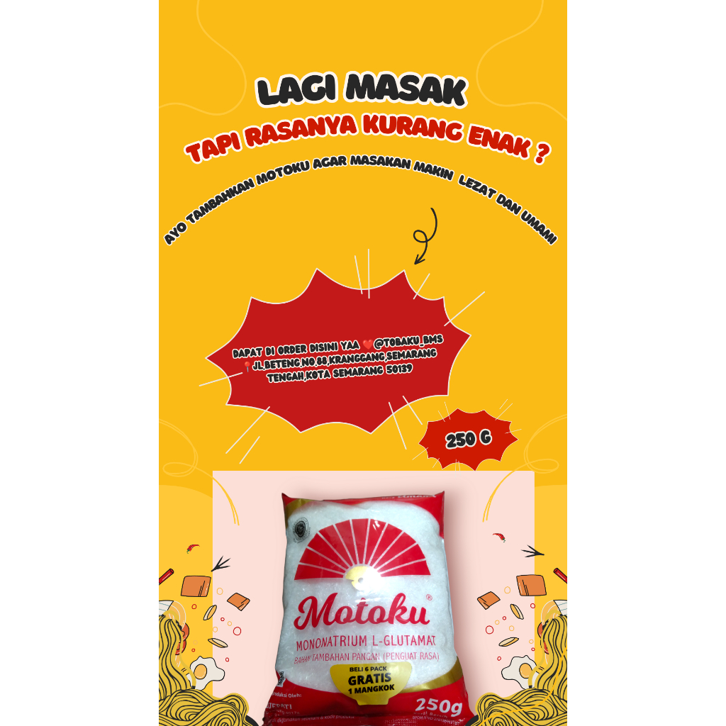 Motoku adalah Micin / Vetsin / Pecin yang merupakan bahan penyedap rasa yang berkualitas. setiap pembeli 6 motoku akan mendapatkan hadiah 1 mangkok. Jadikan motoku sebagai penyedap rasa disetiap masakan anda ☺️