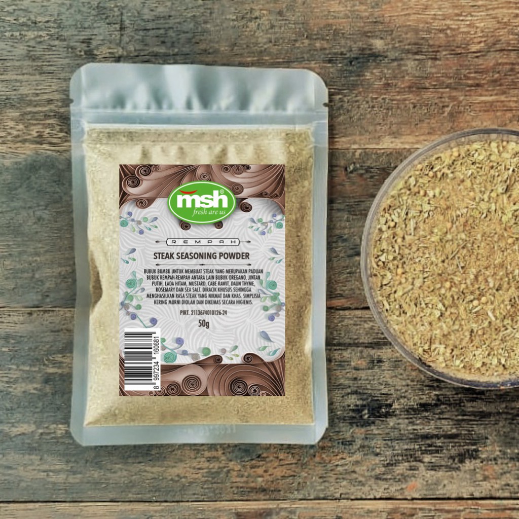 Steak Seasoning Powder adalah bubuk bumbu untuk membuat steak yang diracik khusus dari rempah-rempah pilihan, sehingga menghasilkan rasa steak yang nikmat dan khas. Bumbu ini merupakan simplisia kering murni yang diolah dan dikemas secara higienis.