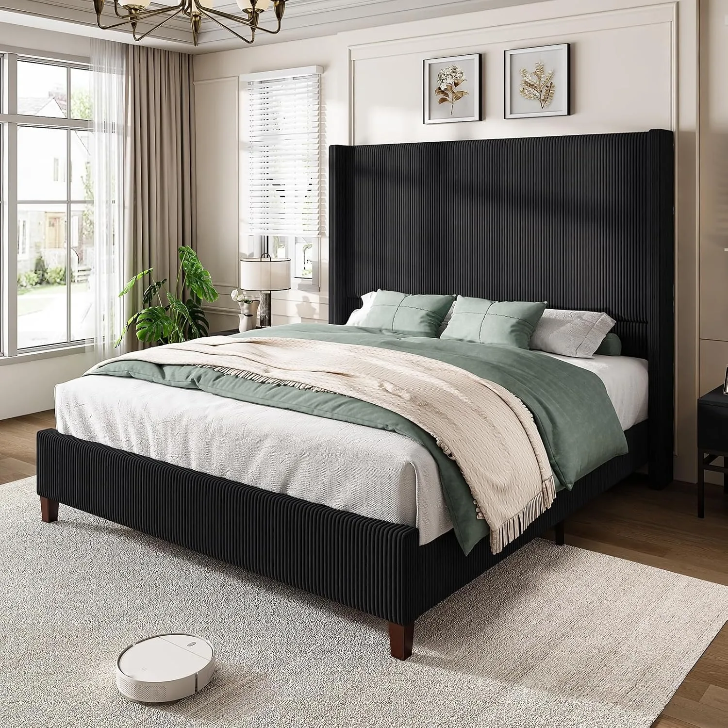 Каркас кровати с мягкой вельветовой обивкой размера «queen-size» 62 дюйма, роскошная кровать-платформа с очень высоким изголовьем со спинкой и вертикальной полосой