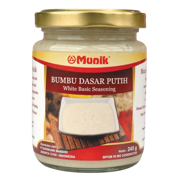 Bumbu Dasar Putih Sari Munik adalah bumbu olahan yang terbuat dari rempah- rempah pilihan terbaik. Komposisi utama antara lain Bawang Merah, Bawang Putih, Kemiri, Garam dan Minyak Goreng menjadikannya sebagai bumbu dasar untuk seluruh masakan gurih dengan harum kemiri. Kalau mau yang gurih, pastikan Bumbu Dasar Putih siap menemani Anda. Cocok untuk Opor Ayam, Semur Daging, Tahu Tempe Bacem, Soto Betawi, Mie Goreng Spesial, Empal Daging dll.