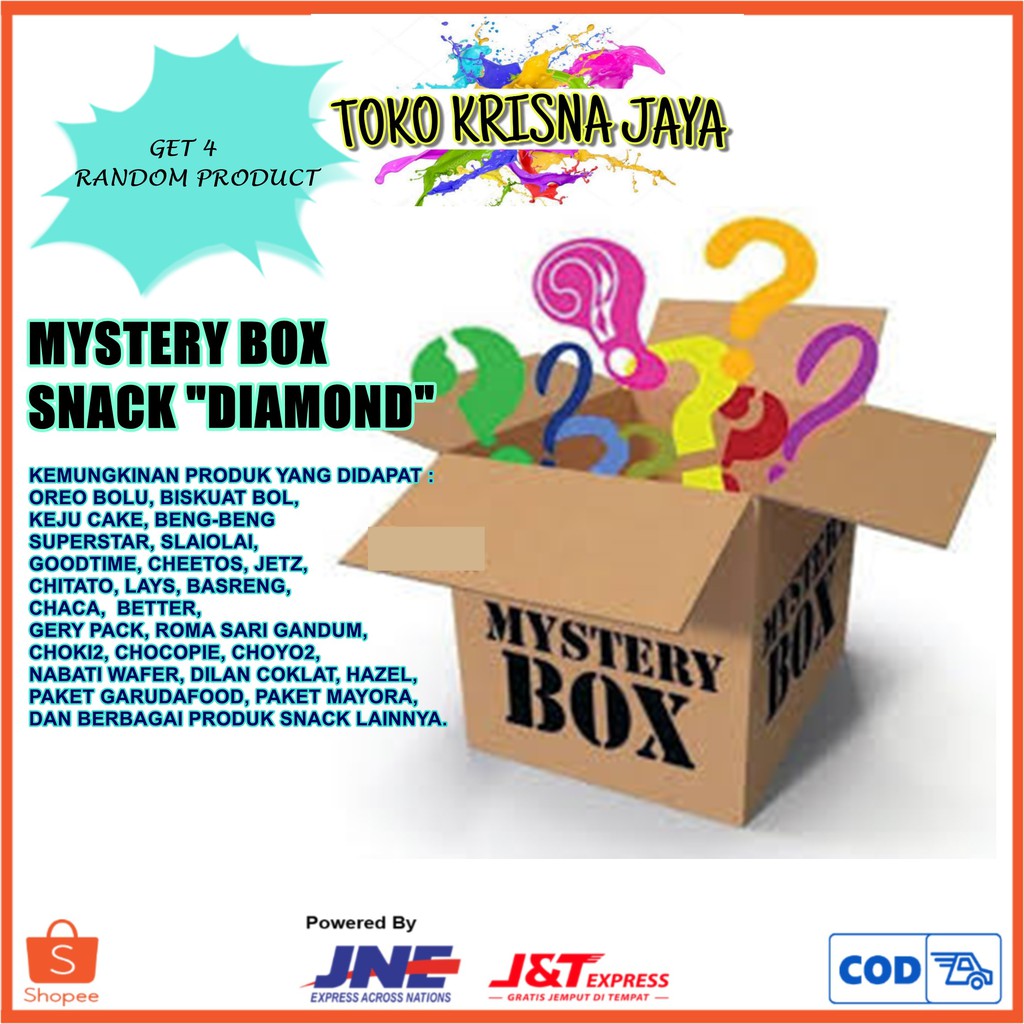 DENGAN MEMBELI PRODUK MYSTERY BOX, PENGGUNA AKAN MENDAPATKAN PRODUK DENGAN KATEGORI BERBAGAI SNACK DI TOKO KRISNA JAYA.