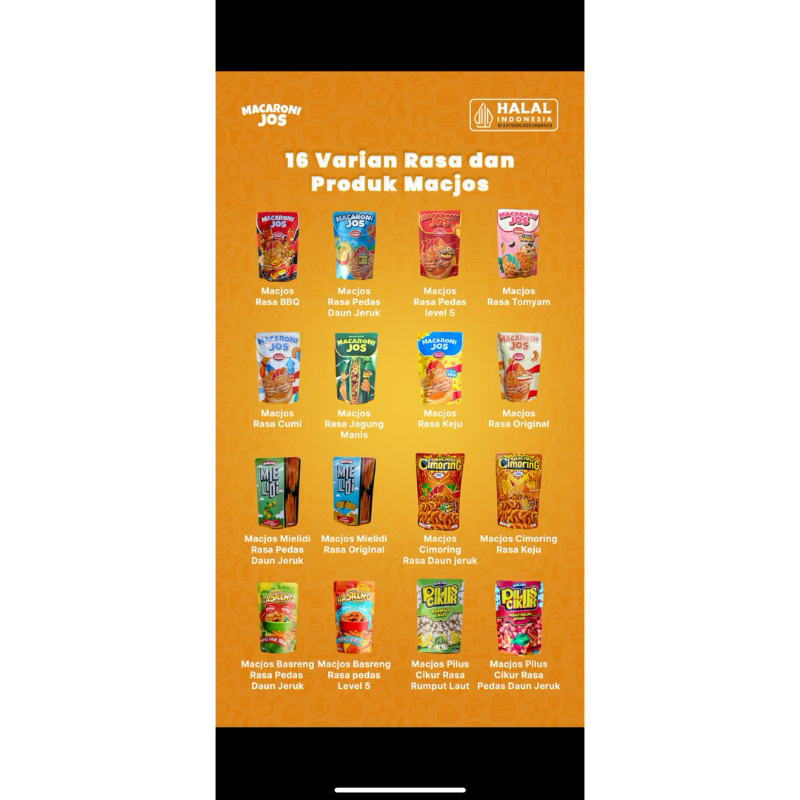 Macaroni Jos adalah camilan kekinian yg dibuat dari bahan-bahan terbaik, dibuat dengan penuh kasih sayang dan ketulusan demi menciptakan cita rasa spesial. Produk baru dan terlaris, Dengan berbagai varian
