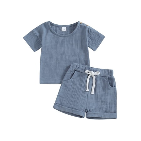 Qtinghua Infant Toddler Baby Boy Summer Clothes Short Sleeve Solid Tops+Elastic Waist Folded Hem Shorts with Pocket Outfits Blue 6-12 Months