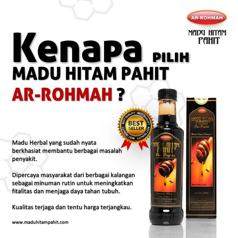 Madu hitam pahit adalah produk spesial yang efektif dalam membantu mempercepat proses penyembuhan berbagai penyakit, naik tingan maupun berat, pengobatan serta untuk pencegahannya. Mengkonsumsi madu hitam pahit memberikan kesan menambah energi dan stamin, badan terasa lebih ringan, segar dan siap digunakan untuk aktivitas tinggi seperti berolahraga. Madu hitam pahit digunakan juga untuk menjaga stamina dan vitalitas, mengkonsumsinya secara rutin dan teratur dapat menjadi jalan penyemuhan berbagai penyakit serta baik untuk perbaikan organ-organ tubuh dan mengoptimalkan kinerjanya, serta menyeimbangkan metabolisme tubuh. Madu hitam pahit merupakan sediaan cairan alami, sinergi formulasi dari madu dan sari tumbuhan pahit yang banyak manfaat. Kini diperkaya dengan propolis dan habbatussauda.