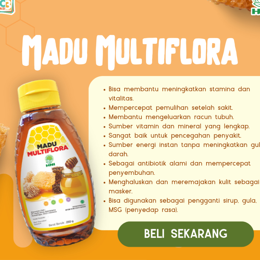 Madu Asli HPAI Multiflora merupakan madu alami tanpa tambahan bahan lain yang terjamin mutu dan keasliannya serta lebih terjaga keutuhan kandungan gizinya. Dihasilkan dari lebah madu unggul “Apis Mellifera”, kaya akan vitamin, mineral, enzim, protein, hormon-hormon, serta zat antimikroba dan zat antibiotik. Madu Asli HPAI Multiflora telah lulus kendali mutu yang ketat dan mempunyai kadar air yang rendah sehingga tidak terjadi proses fermentasi.