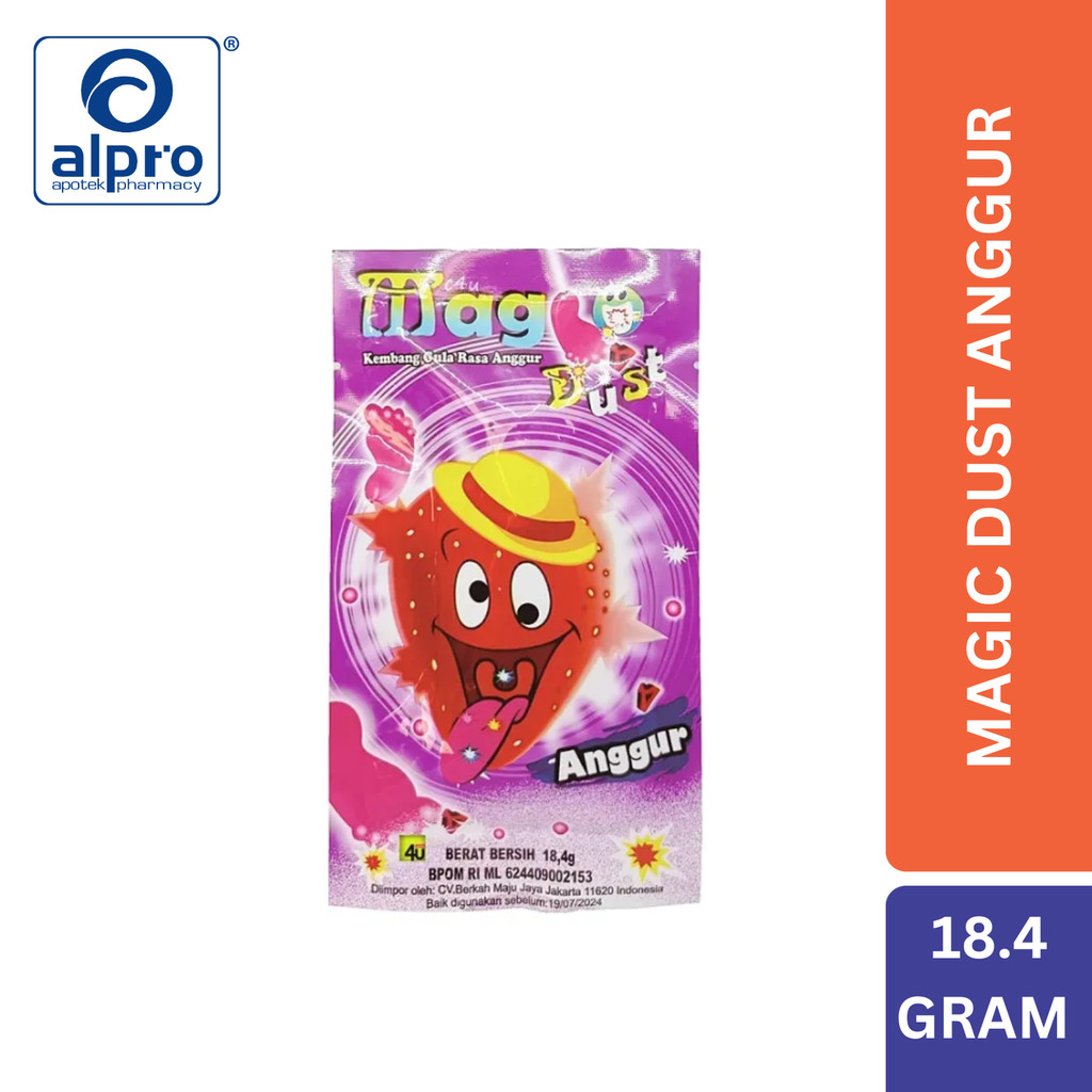 Magic Dust Anggur 18.4g adalah permen bubuk popping candy dengan rasa anggur yang memberikan sensasi meletup-letup di mulut. Produk ini populer di kalangan anak-anak dan remaja karena pengalaman unik yang ditawarkannya.