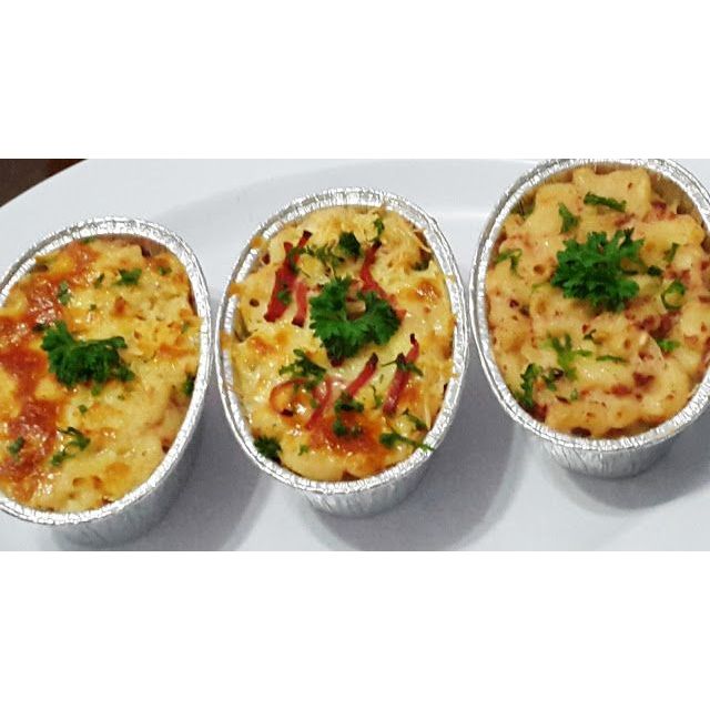Makanan ringan yang terbuat dari makaroni, daging, telor dan keju dengan berat 160 gram yang rasanya sangat enak