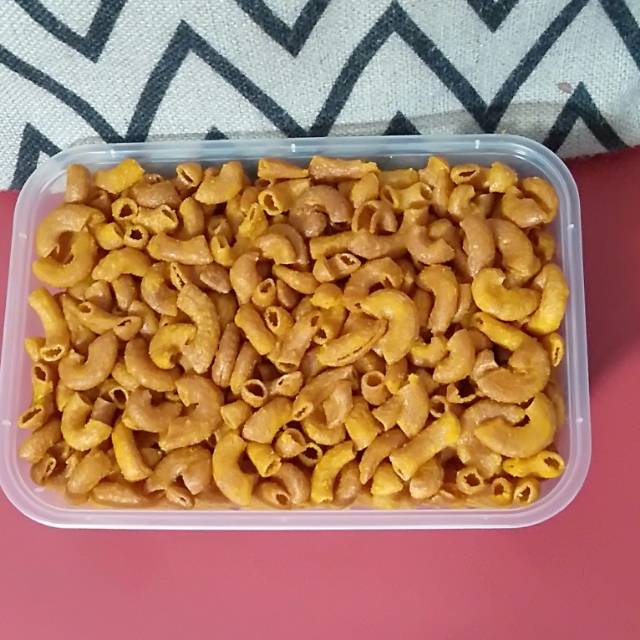 Makaroni goreng, home made, fresh, kriuk dan gurih. Dikemas dalam box plastik ukuran 750 ml.