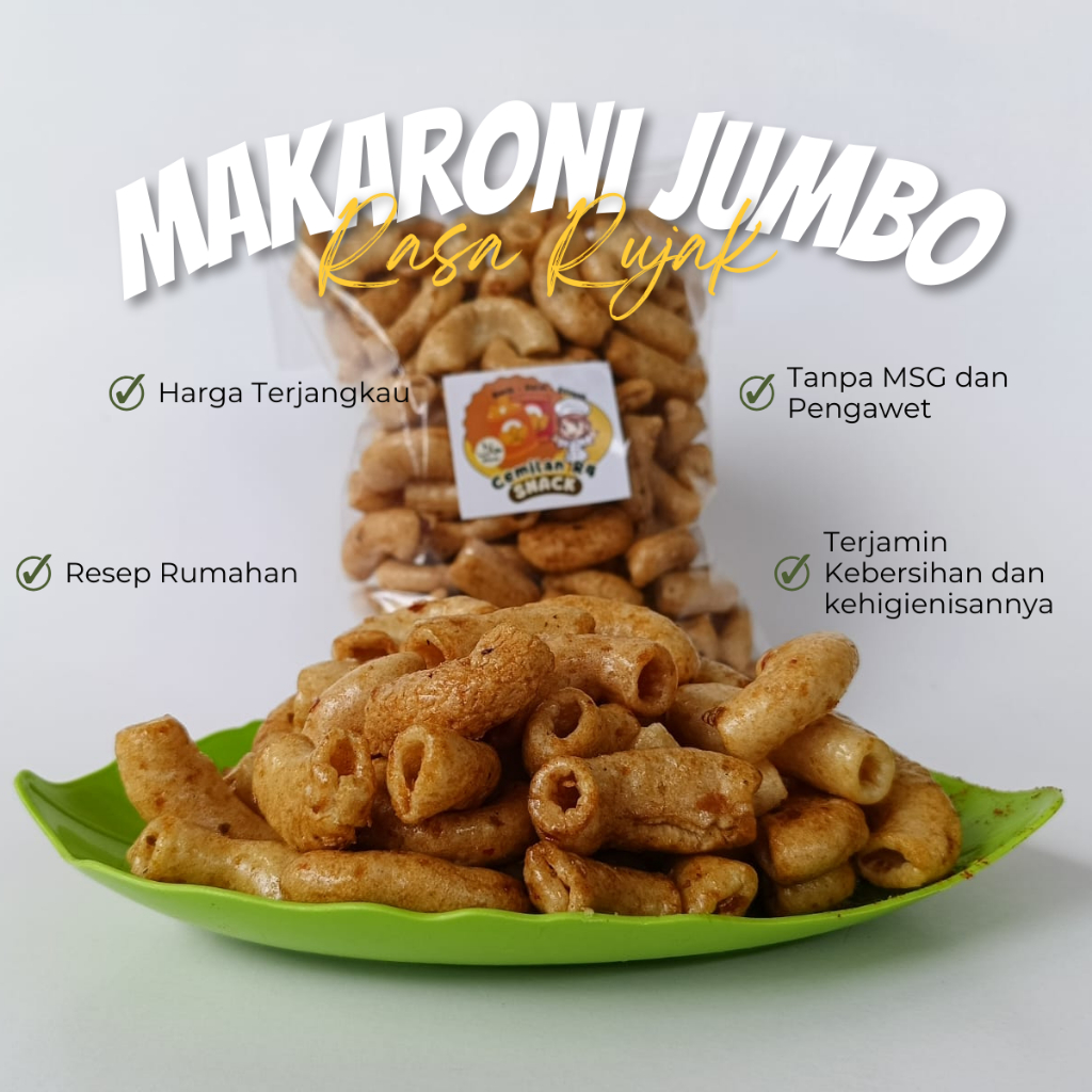 Makaroni Jumbo Rasa Rujak adalah pilihan sempurna untuk memenuhi selera Anda yang paling eksklusif. Dibuat dengan teliti menggunakan bahan-bahan berkualitas tinggi serta telah memperoleh sertifikasi HALAL, [Nama Produk] menghadirkan pengalaman menyantap pasta yang luar biasa.