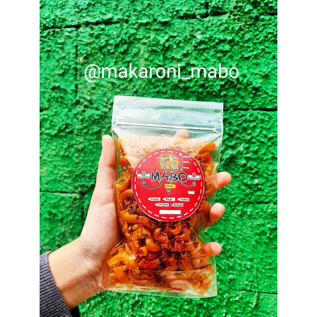 Makaroni Mabo rasa balado gurih dengan bumbu balado yang nikmat dan eksklusif berbeda dengan yang lain. Menjadikan Makaroni Mabo asyik untuk dinikmati setiap saat.Cocok untuk cemilan di rumah, saat perjalanan, atau bisa dijual lagi.