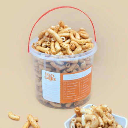 Makaroni Rujak — berukuran jumbo, dibalut bumbu rujak yang rasanya pedas, manis, dan gurih. Cocok sebagai teman makan.