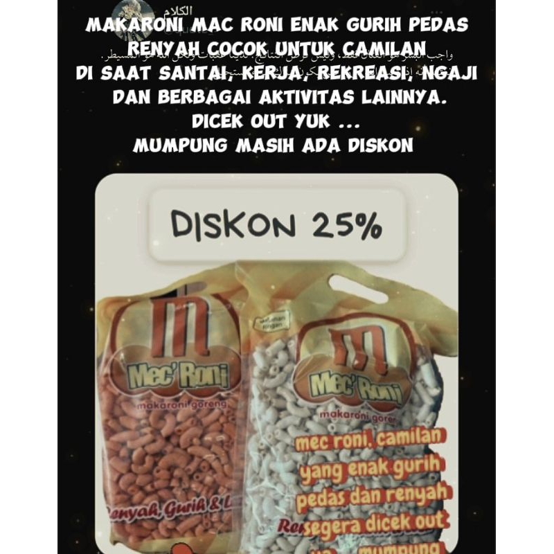 Makroni Macaroni Mec Roni Goreng Rasa Pedas Original Gurih Renyah 350gr. Makroni goreng paling laris dipasaran. Sangat layak digunakan camilan saat belajar, bekerja, rekreasi, ngaji, dll. Silahkan coba