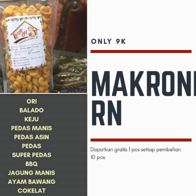 Makroni Rn 100 gr cocok untuk teman ngemil di rumah tersedia berbagai macam rasa. Untuk pembelian silahkan cantumkan rasa dan rasa cadangan di kolom catatan