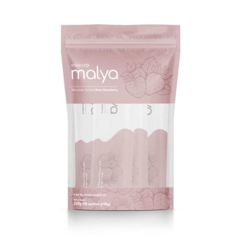 Essenzo Malya Strawberry adalah minuman serbuk yang memiliki kandungan Marine Collagen, Vitamin C, L Glutathione, dan Tremella rasa Strawberry. Marine Collagen dikenal mampu menjaga elastisitas kulit agar lebih kencang dan kenyal, serta mengurangi kerutan. Komponen aktif dalam kandungan Essenzo Malya, seperti Vitamin C, Asam Amino, Protein, Karbohidrat, dan serat berfungsi sebagai anti oksidan yang membantu kulit tetap lembab, sehat, juga cerah.