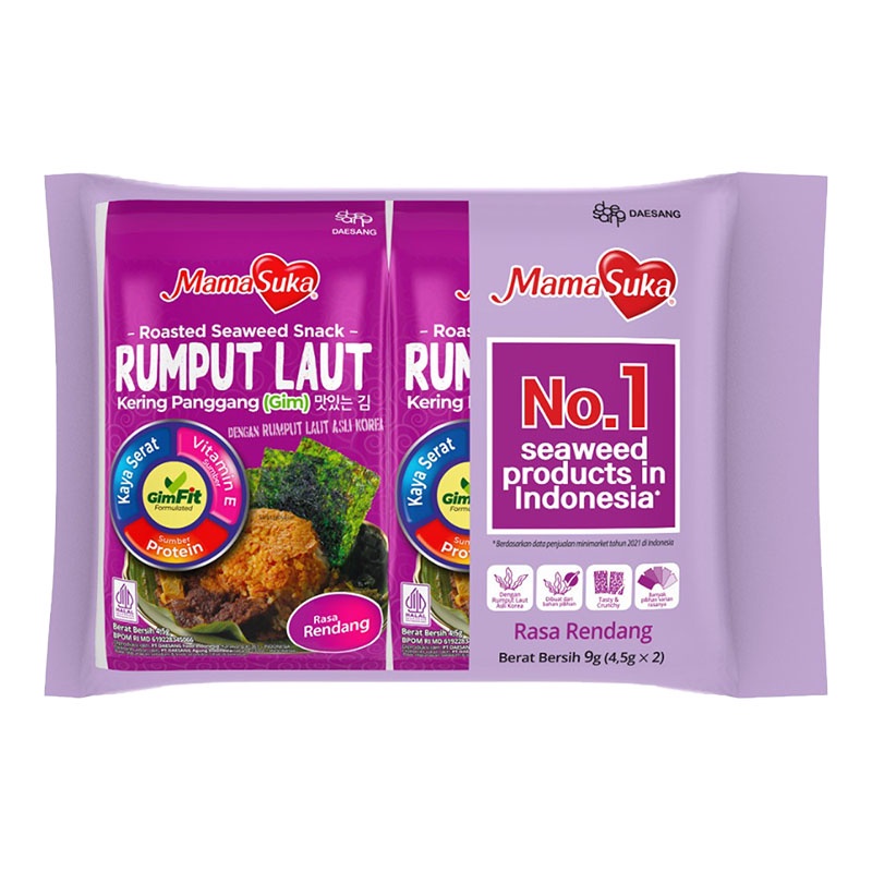 MamaSuka Rumput Laut Rendang 2 x 4,5 g merupakan camilan berupa lembaran rumput laut lezat yang dipanggang. Kerenyahan dalam setiap lembarnya berpadu baik dengan rasa rendang yang khas. Menghasilkan makanan ringan yang cocok untuk dinikmati dalam banyak momen hidupmu. Selain itu, juga bisa mendampingi santapan besar dengan nasi atau mie hangat. Bawa MamaSuka Rumput Laut rendang ke mana saja berkat kemasan praktisnya dan bagi momen snacking bersama teman-temanmu.