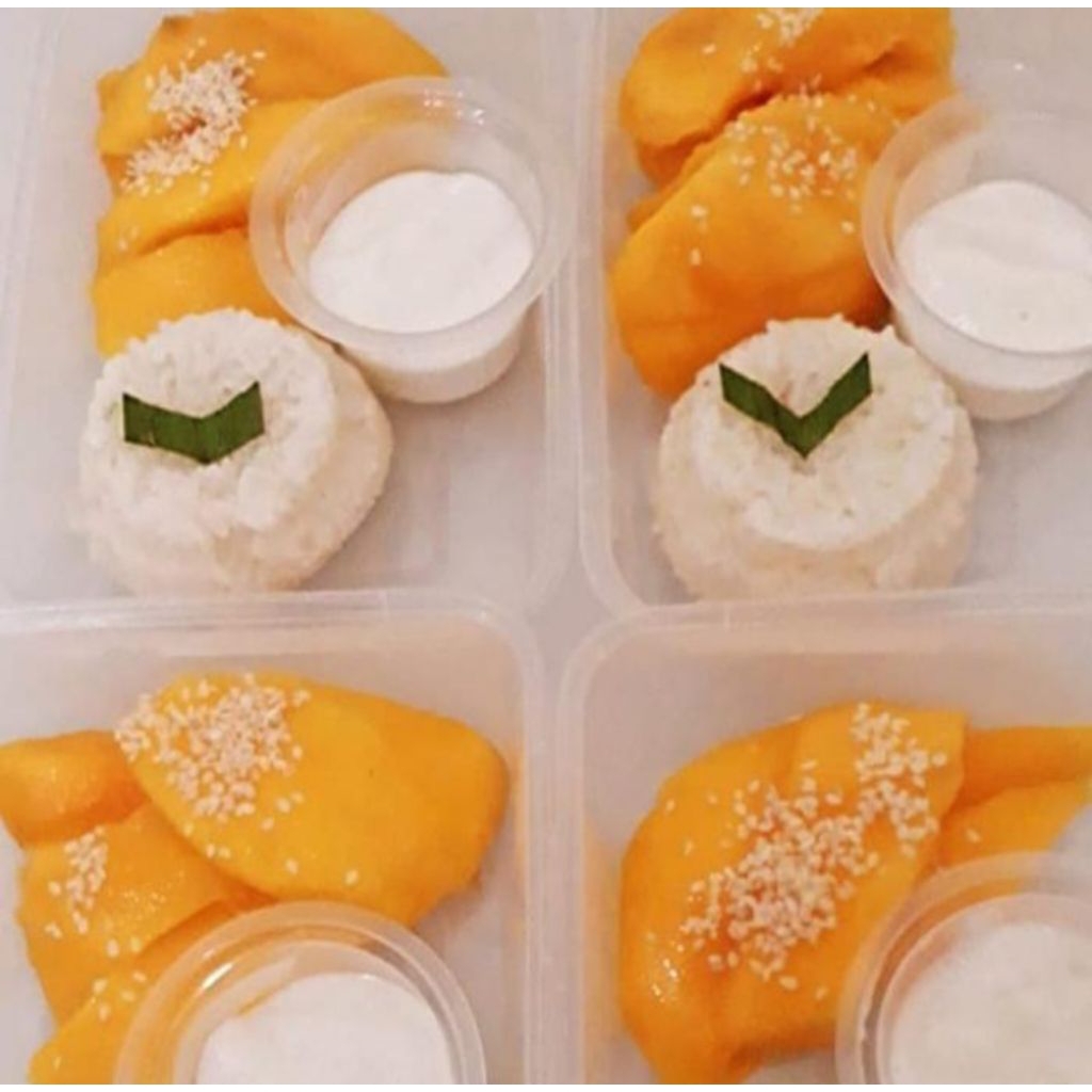 berat 250 ml menggunakan thinwal 250 ml ketan dibagian bawah lalu potongan mangga diatasnya sauce terpisah berat 500 ml ketan dicetak bulat mangga dipotong sauce terpisah