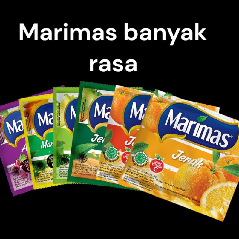 Marimas minuman serbuk dengan aneka rasa yang dapat anda nikmati. Harga tertera di atas harga 1 renceng isi 10 sachet.