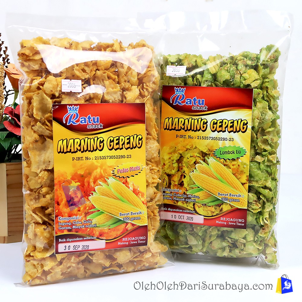 Marning, cemilan jadoel tapi dikemas dengan format kekinian. Marning gepeng sesuai namanya, marning yang berbentuk gepeng ya. Ini ada rasa lombok ijo dan rasa pedas manis. Komposisinya ada jagung, cabe / cabe ijo, gula, garam dan minyak nabati
