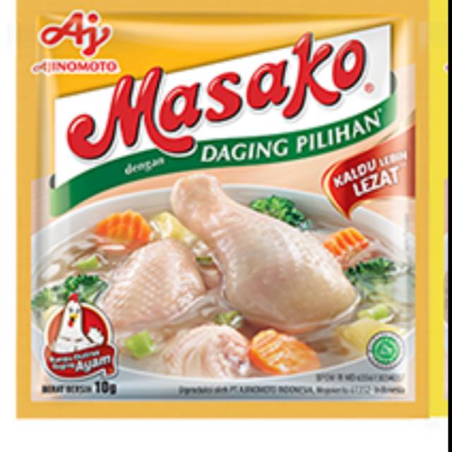 Masako, Bumbu Kaldu Penyedap dibuat dengan perpaduan sempurna antara daging segar berkualitas, bumbu dan rempah pilihan. Sehingga secara praktis menyempurnakan kelezatan masakan Anda sehari-hari dengan rasa dan aroma dari daging asli sama seperti kaldu buatan di rumah.
