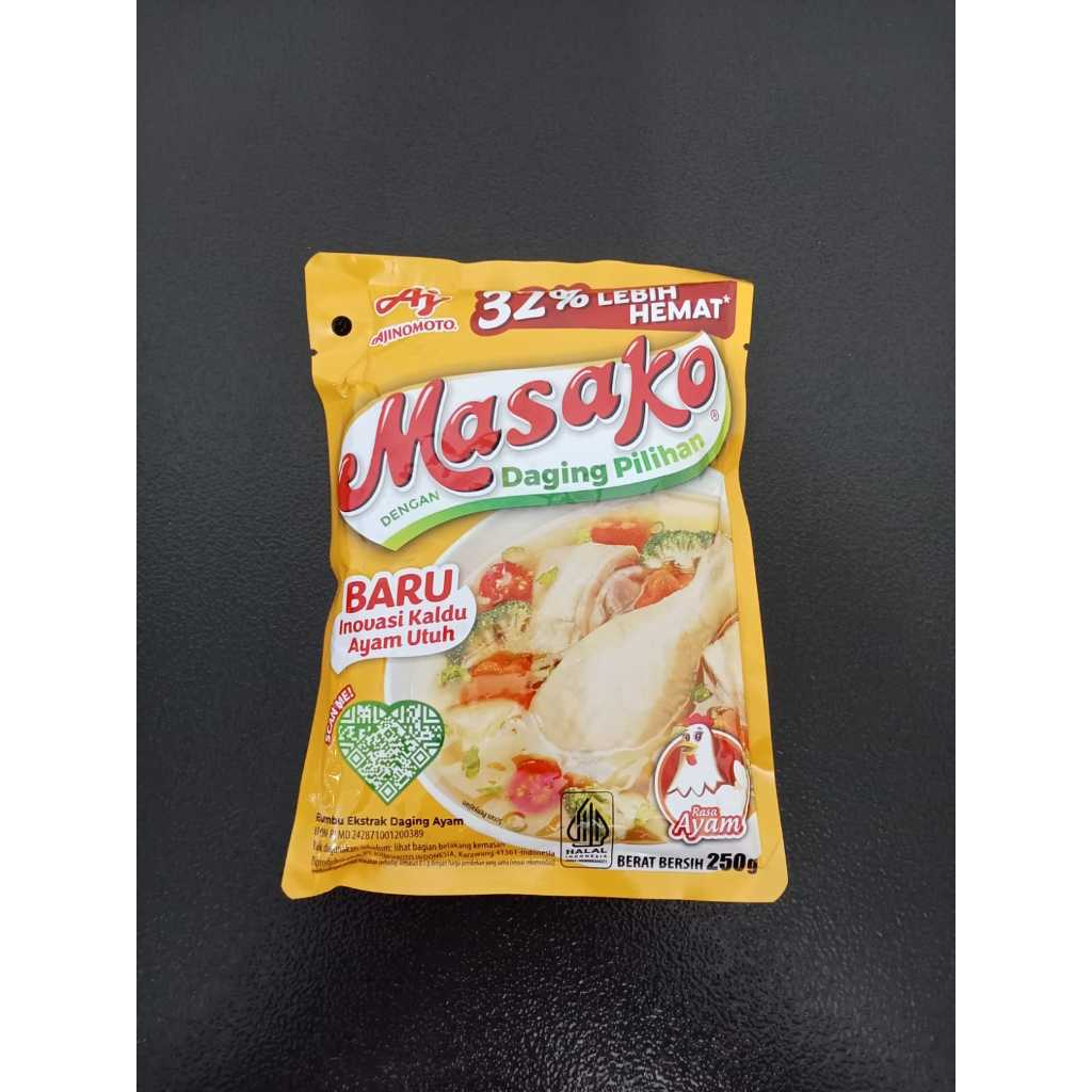 Masako bumbu ekstrak daging ayam, dibuat dengan daging ayam yang berkualitas serta kombinasi bumbu dan rempah pilihan. Menghasilkan rasa kaldu yang lezat, seperti kaldu buatan sendiri di rumah, untuk masakan sehari-hari dengan cara yang mudah dan praktis. Masako sajikan #KenikmatanHakiki untuk keluarga, makanan jadi makin enak dan lezat, jadi pingin tambah lagi! Kandungan garam/ natrium 520 mg per sajian Sesuai dengan angka kecukupan gizi yang direkomendasikan yaitu