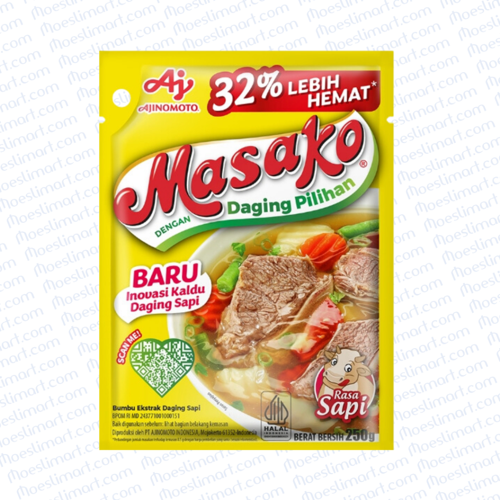 Masako® bumbu ekstrak daging sapi, dibuat dengan daging sapi yang berkualitas serta kombinasi bumbu dan rempah pilihan. Menghasilkan rasa kaldu yang lezat, seperti kaldu buatan sendiri di rumah, untuk masakan sehari-hari dengan cara yang mudah dan praktis. Masako® sajikan #KenikmatanHakiki untuk keluarga, makanan jadi makin enak dan lezat, jadi pingin tambah lagi! Kandungan garam/ natrium 520 mg per sajian Sesuai dengan angka kecukupan gizi yang direkomendasikan yaitu